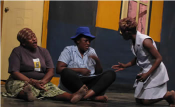 Pictured above is Joyce Mpofu (playing the mother of a rape victim), Chipo Bizure (playing the rape victim) and Rutendo Chigudu (playing the sister of the victim) arguing about the legal route the sister is about to take in addressing the rape case of her young sister during the run-up to the 2008 election run-off.